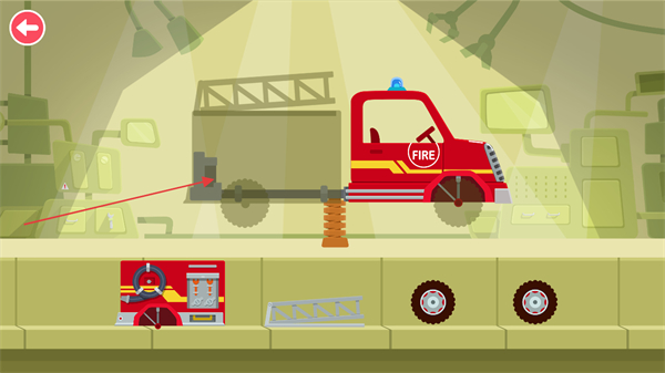 1、组装消防车,将车头、梯子、车轮等部件依次安装到车身,完成车辆组装。