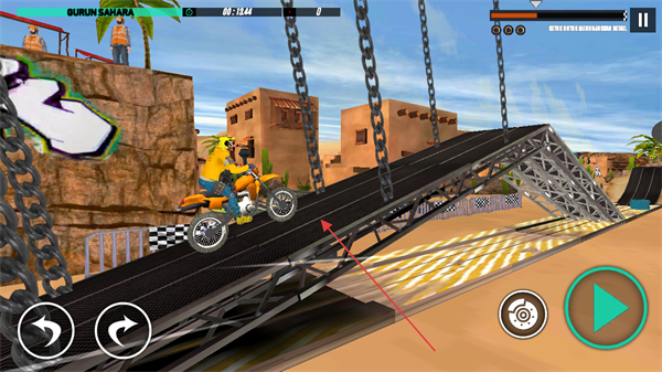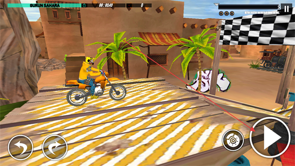 1、点击开始按钮,驾驶摩托车在沙漠特技赛道行驶,利用左右转向按钮控制方向,冲过起点。
