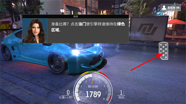 2、控制油门操作,通过右侧的油门按钮,控制赛车的油门,使引擎转速维持在绿色区域,为起步准备。