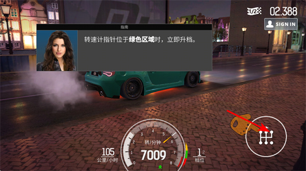 3、执行换挡操作,当转速指针位于绿色区域时,点击换挡按钮,及时升档,提升赛车的速度,保持竞速优势。