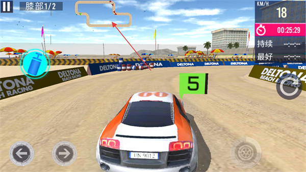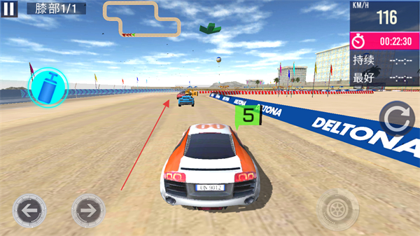 1、通过左右箭头控制赛车在海滩赛道行驶,穿过拱门,注意左侧车辆,提升车速。