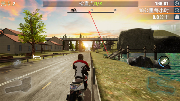 2、操控摩托沿道路行驶,依次通过绿色的检查点装置,积累检查点进度。