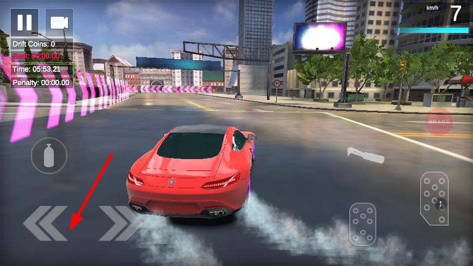2、点击左侧左转向按键,可控制车辆向左转向,在弯道处进行漂移操作,获取金币提升游戏成绩。
