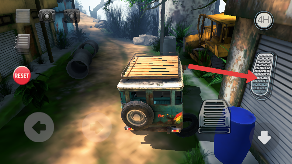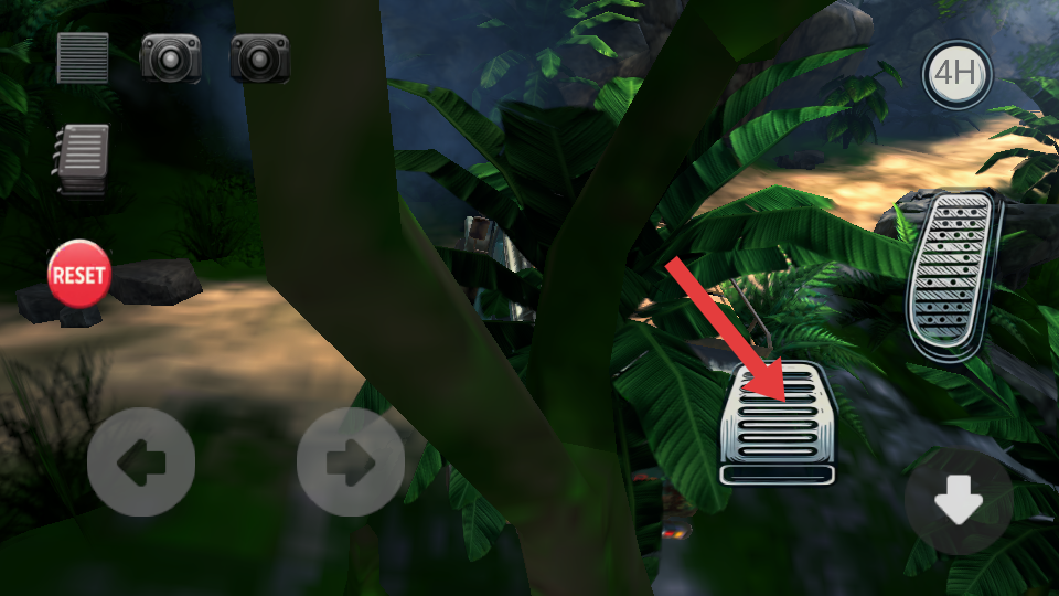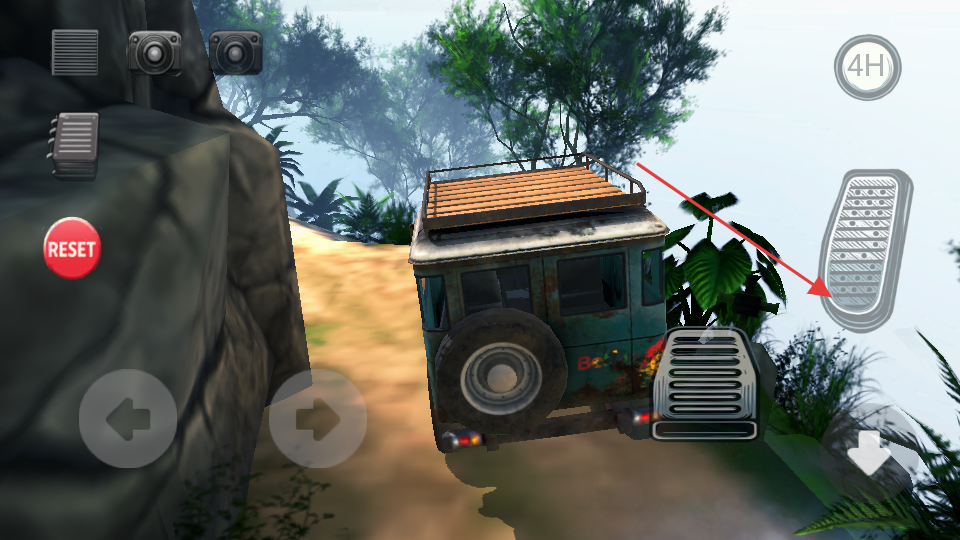 1、驾驶越野车时,通过右侧的油门踏板按键控制车辆前进动力,使其在崎岖的越野路径上行驶。