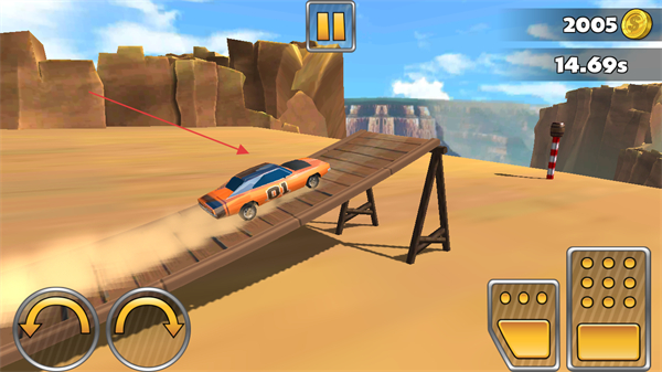 1、操控赛车在沙漠特技赛道行驶,利用右侧按键控制赛车加速、特技动作,冲上坡道收集金币。