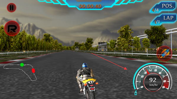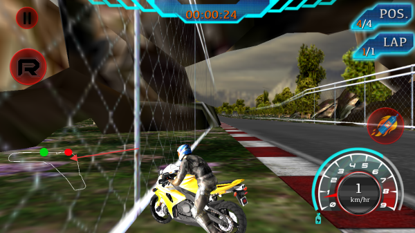 1、进入游戏,留意屏幕上方显示的时间00:00:12、排名POS.1/4和圈数LAP1/1,操控摩托车起步,通过左侧虚拟按键控制方向。