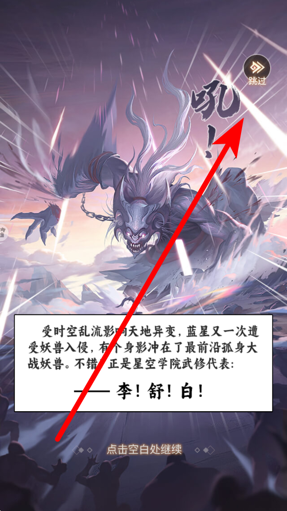 1、开启游戏在登录界面点击开始游戏,进入剧情动画阶段,画面呈现妖兽入侵等开场设定,可留意右上角跳过按钮,快速推进至后续界面。
