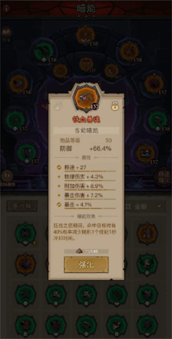 2、暗能装备选择元祖武器提供闪避加成,铁血兽魂项链强化生存,通过装备属性叠加,配合技能效果将闪避率提升至70%,大幅增强战场生存能力。