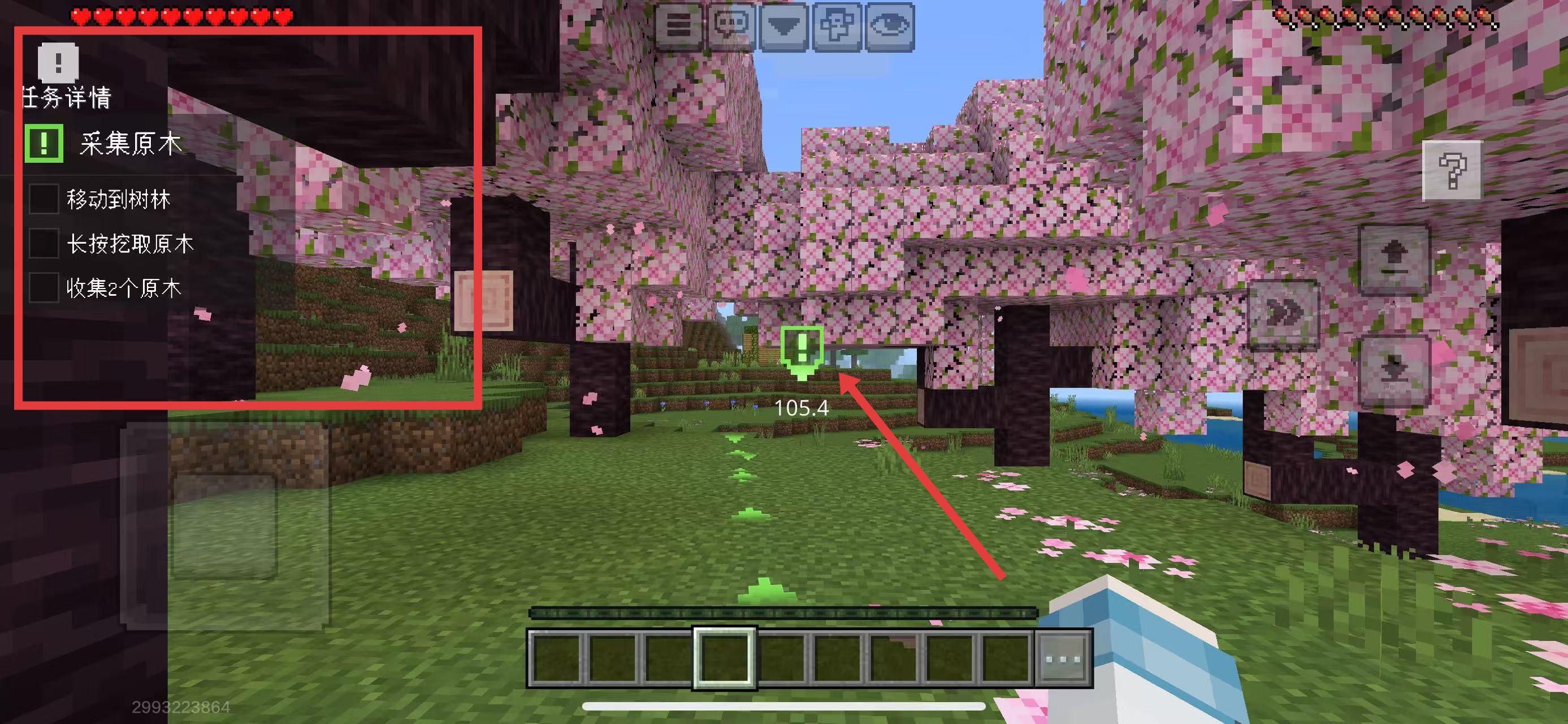 2、左侧任务详情显示采集原木任务,需移动到树林绿色感叹号处,按提示前往完成移动到树林步骤。