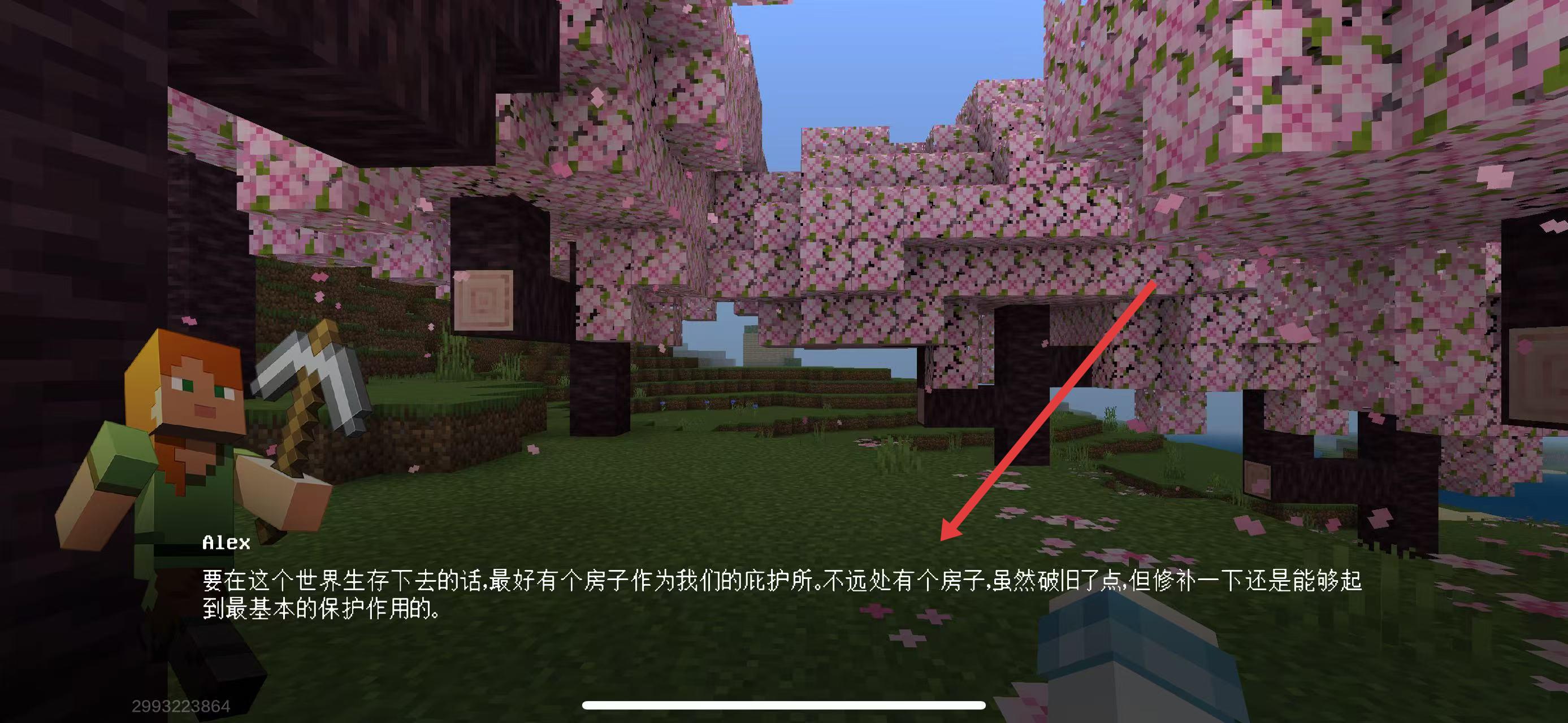 1、画面中角色Alex提示需找庇护所,按指引朝箭头方向前进,可找到破旧房子,后续可修补用作生存庇护所。