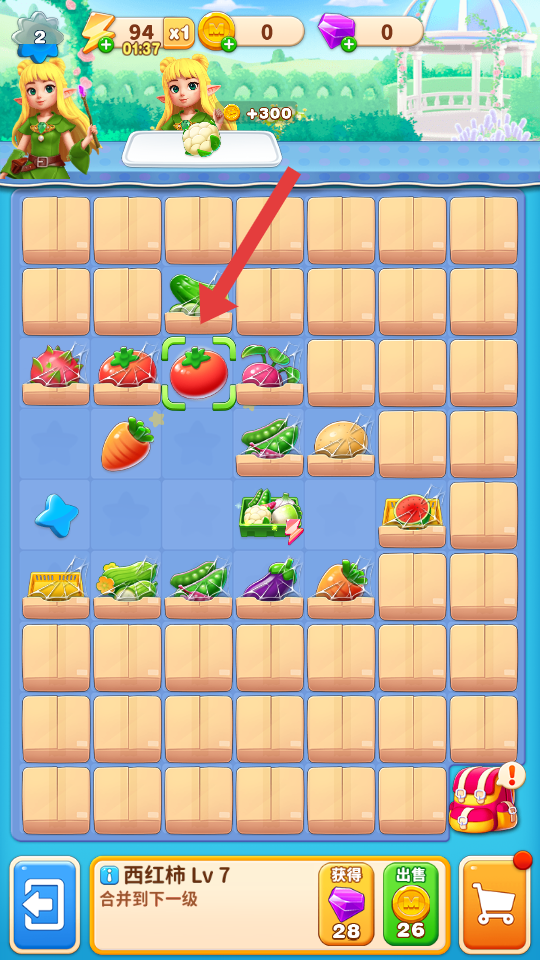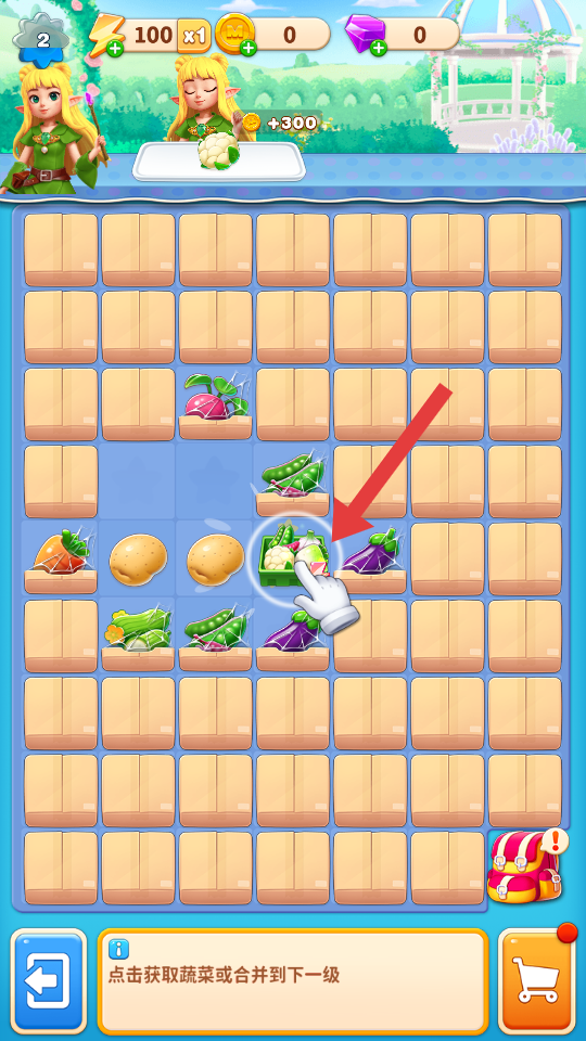 2、点击获取蔬菜或合并到下一级,将相同的蔬菜合并升级,提升蔬菜等级,解锁更高价值的蔬菜种类,增加资源获取效率。