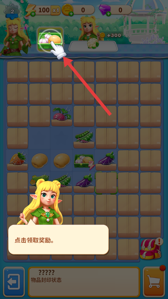 1、点击领取奖励区域的蔬菜道具,获取初始资源,为后续蔬菜合并和经营做准备,同时留意上方的金币、钻石等资源增长。