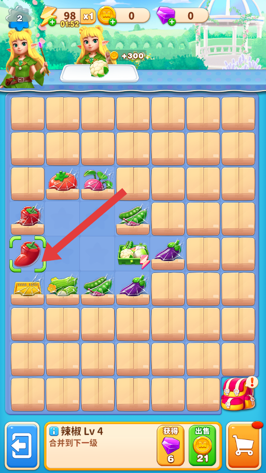 3、将辣椒等蔬菜合并升级如Lv4,可选择出售获取金币或继续合并到下一级,根据资源需求合理选择操作,积累财富。