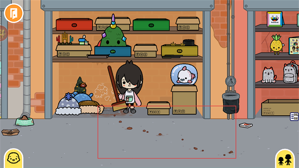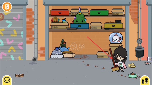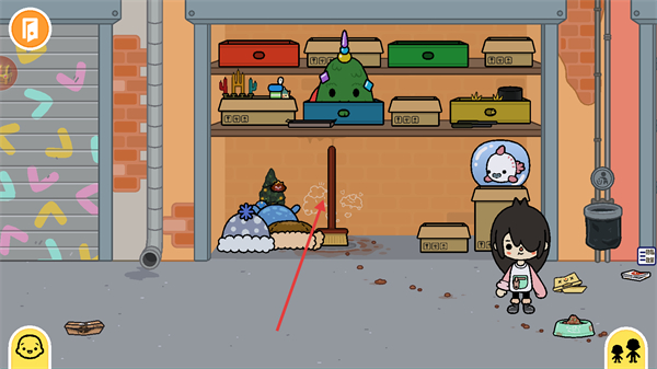 2、进入仓库之后,点击货架后方的扫帚,拖动它。