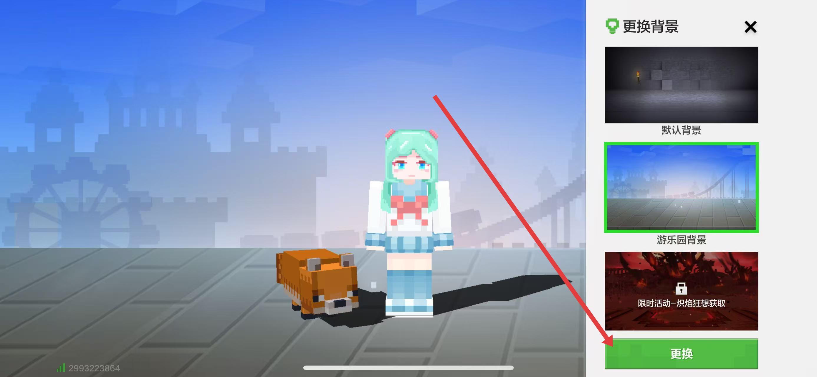 3、选定背景如游乐园背景后,点击下方绿色更换按钮,即可应用新背景,更新主界面显示。