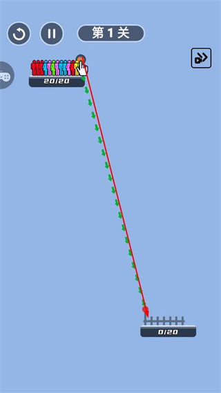 3、返回主界面后选择第1关,点击上方人群处并按指引拖动至下方平台,完成人员转移。