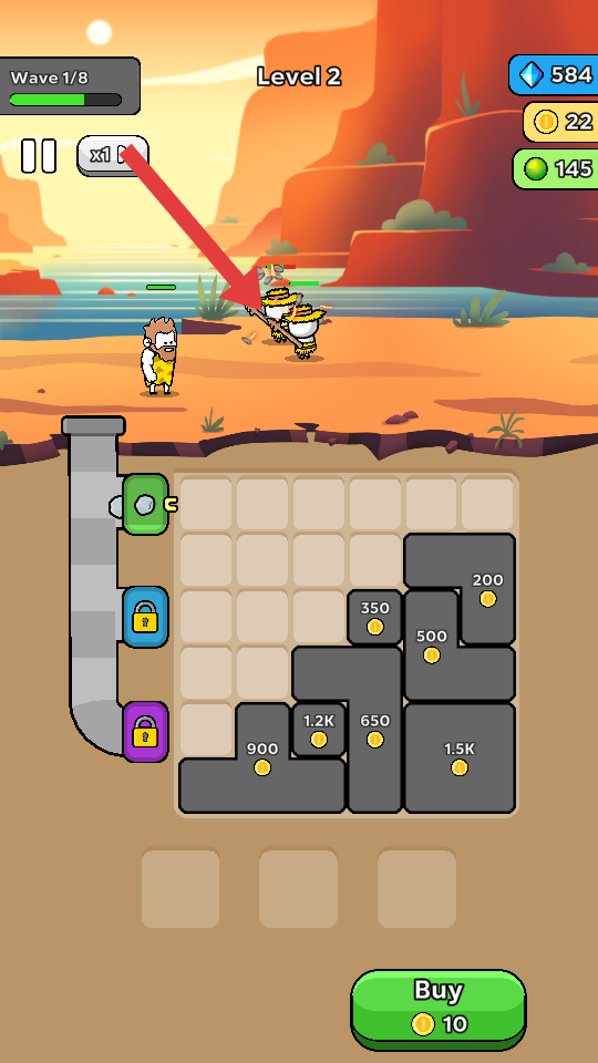2、点击Buy按钮消耗10金币,提升己方战力或解锁新的攻击方式,助力抵御敌方波次攻击,同时积累更多金币。