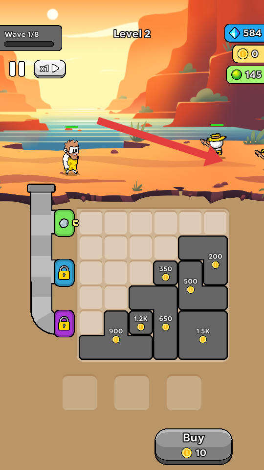 1、在Level2的沙漠场景中,操控角色攻击敌方单位,获取金币奖励,金币可用于解锁下方的灰色区块,挖掘资源。