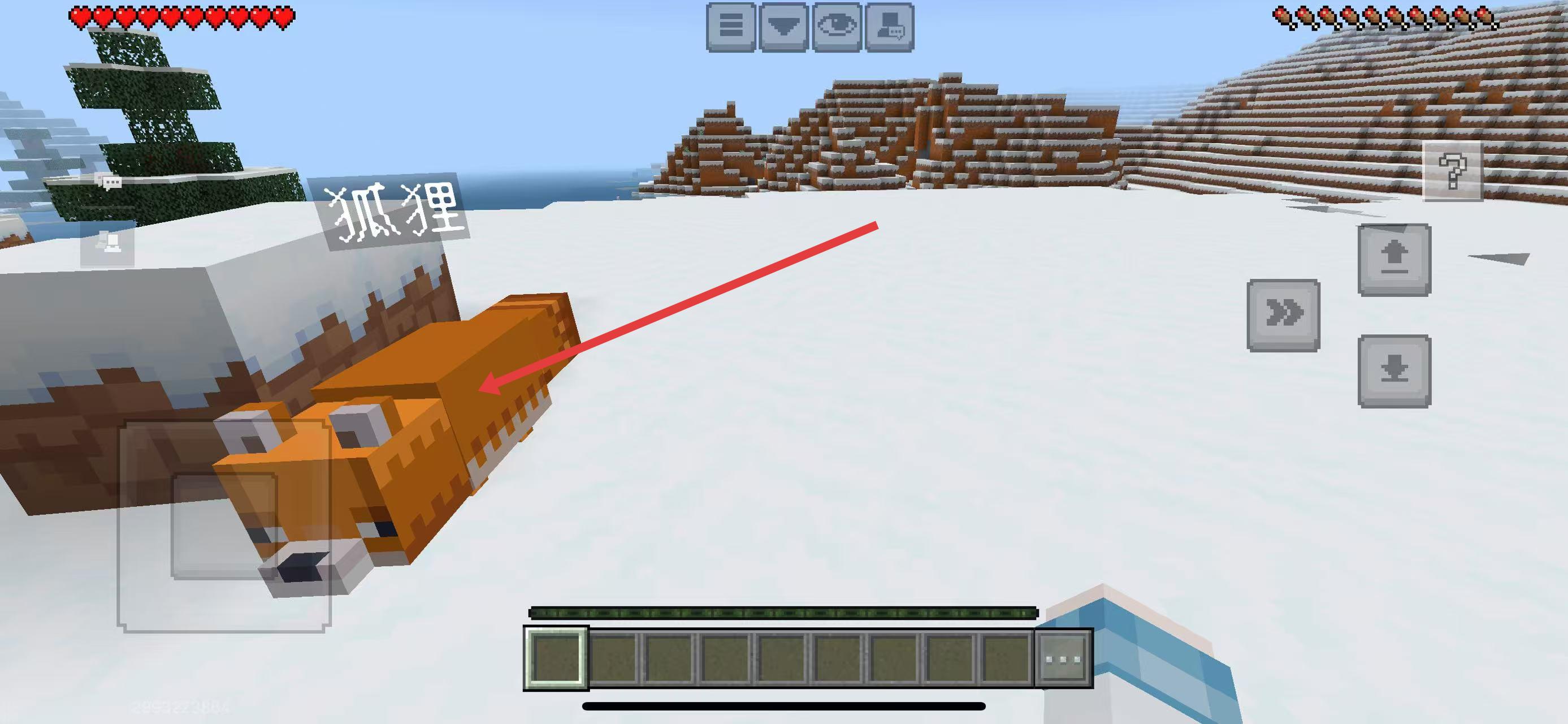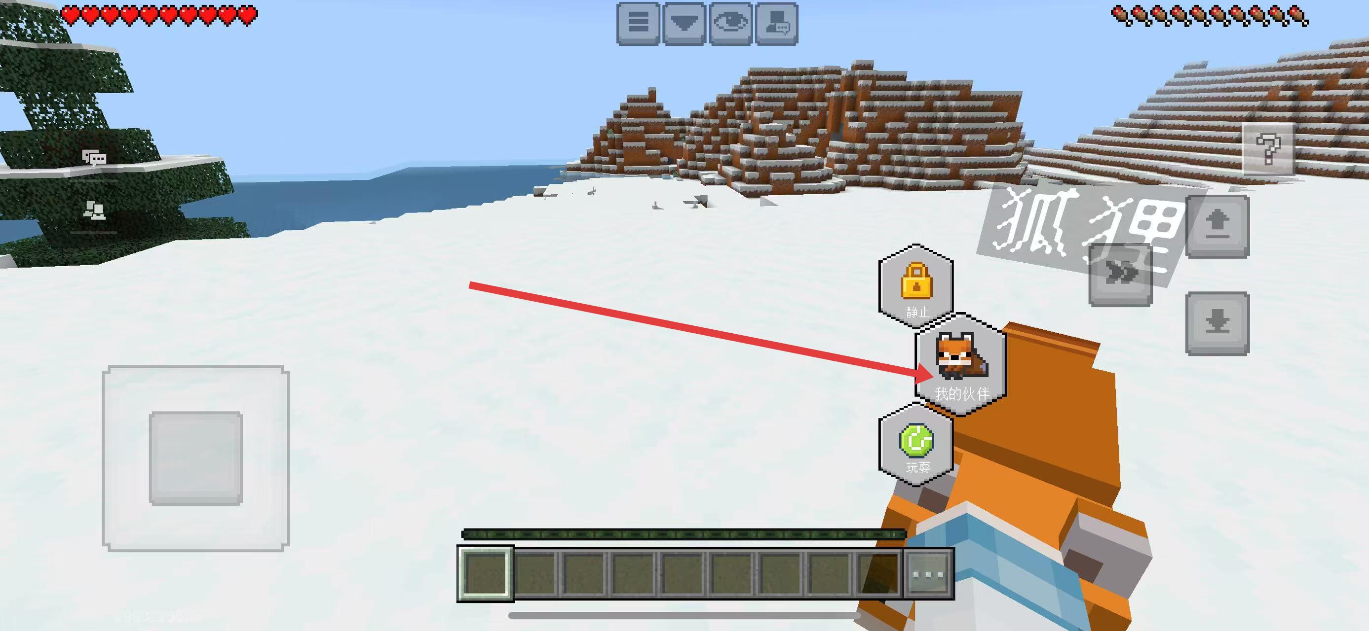 1、在雪地场景中,留意带有狐狸标识的橙色生物,靠近它,通过互动操作可将其设为我的伙伴,让狐狸成为冒险同行小伙伴。