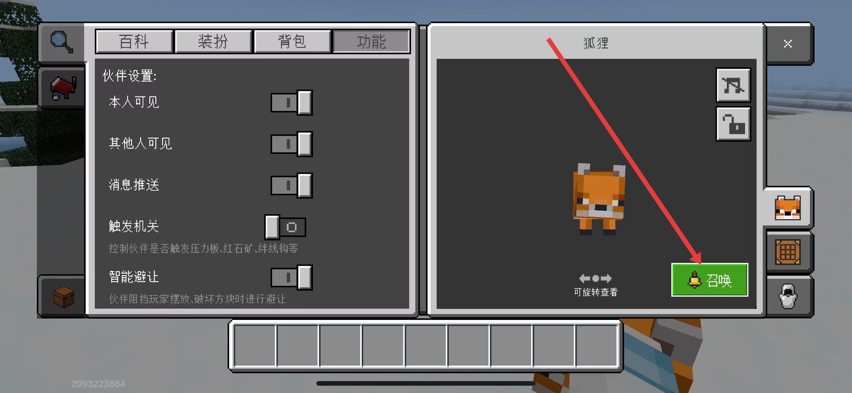 3、当狐狸不在视野内时,进入伙伴功能界面,找到狐狸对应的设置栏,点击绿色召唤按钮,就能把狐狸快速召唤到当前场景,继续陪伴探索雪地等区域,助力生存冒险。