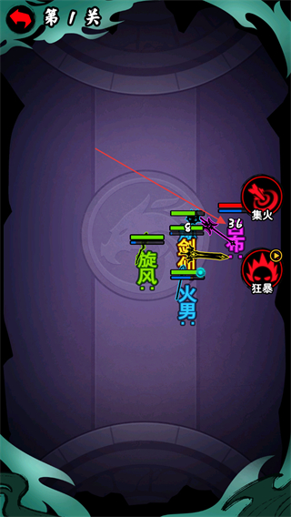 1、操控带有火等属性的文字,移动与敌方文字碰撞,触发攻击削减敌方数值。