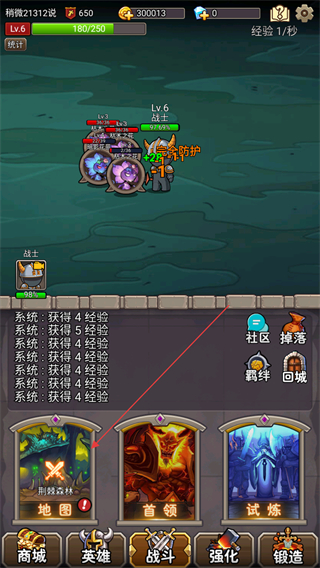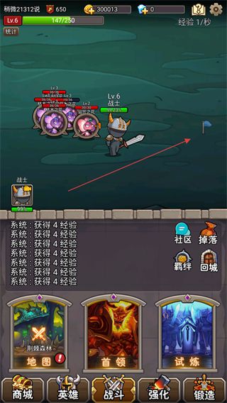 1、操控战士在黑锋丛林地图中自动战斗,攻击怪物获取经验和金币,向旗帜目标推进。