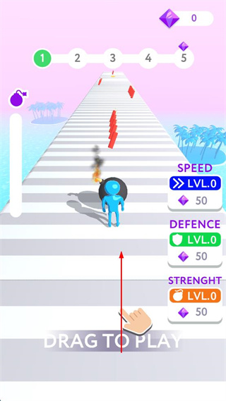 1、拖动屏幕控制蓝色小人在跑道上前进,躲避红色障碍物,收集道具。