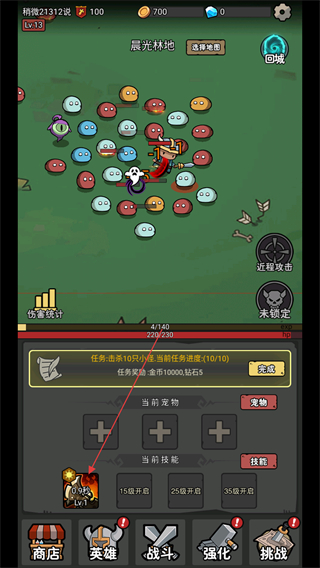 4、完成10只小怪的任务后,点击“完成”领取奖励,解锁新宠物和技能,提升战力继续挑战。