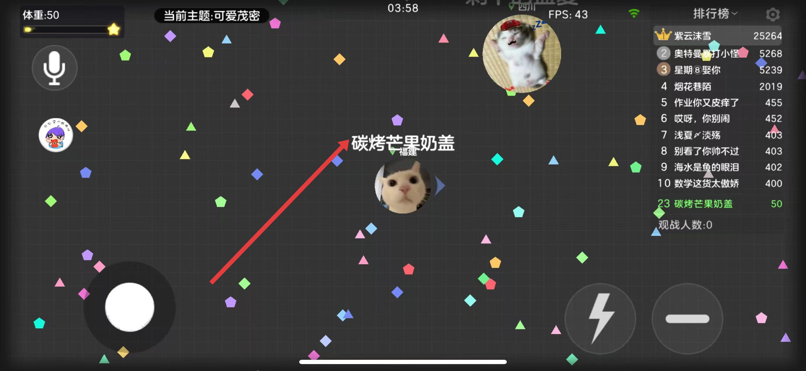 3、不断吞噬地图上的彩色方块和其他小球来增大自身体积,利用吐球、分身等技巧,努力让自己的球球在规定时间内达到更大尺寸以实现霸屏。