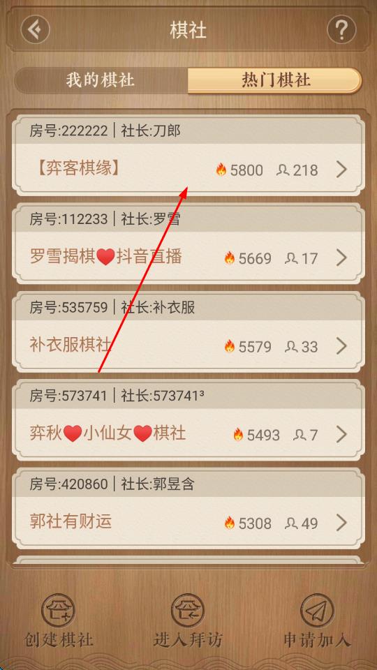 2、进入热门棋社标签,选择您想要加入的棋社,点击进入该棋社详情页面。
