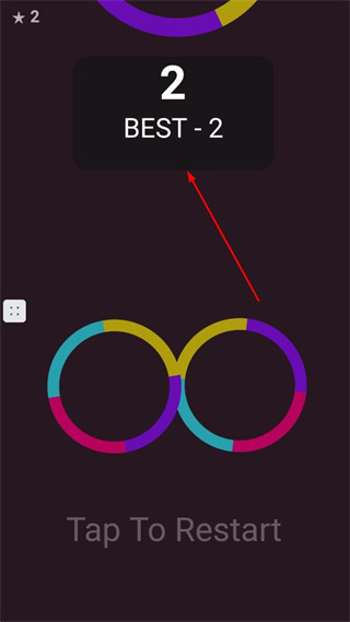 4、游戏结束界面显示当前得分2和最佳-2,下方有重新开始提示,点击屏幕重新开始游戏。