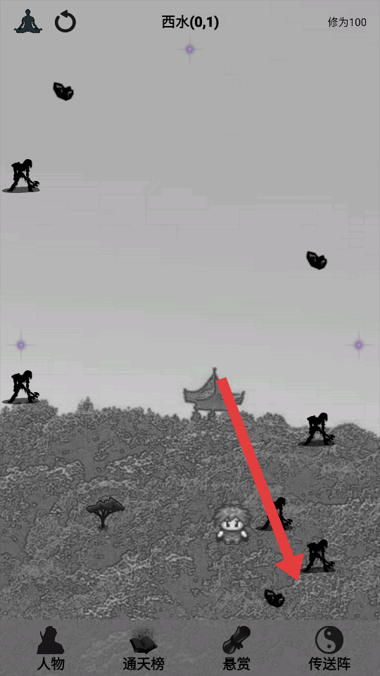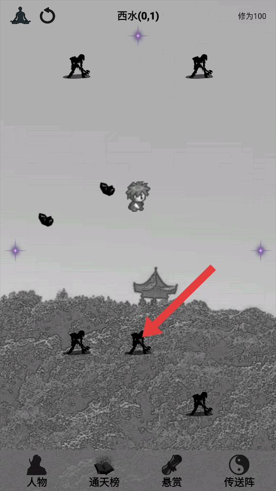 1、在西水0,1区域探索,留意黑色剪影怪物和紫色星光点,探索亭台、树木区域,寻找修仙资源,推进修仙进程。