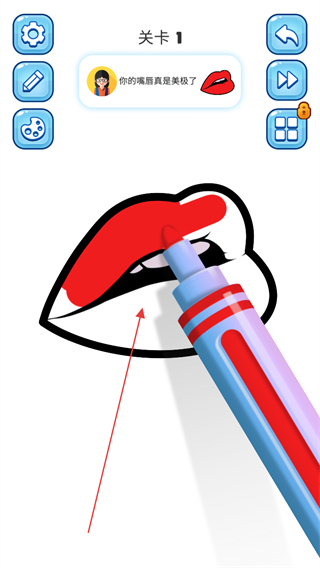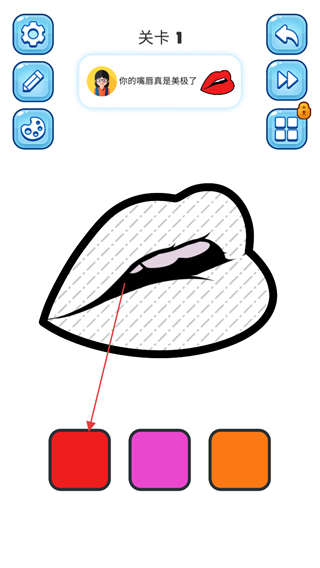 4、用画笔涂抹嘴唇区域,完成红色填充,推进关卡进度。