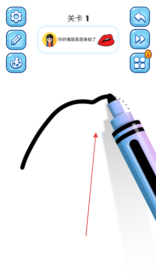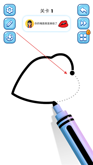 1、进入关卡1,使用画笔工具绘制嘴唇的轮廓线条。