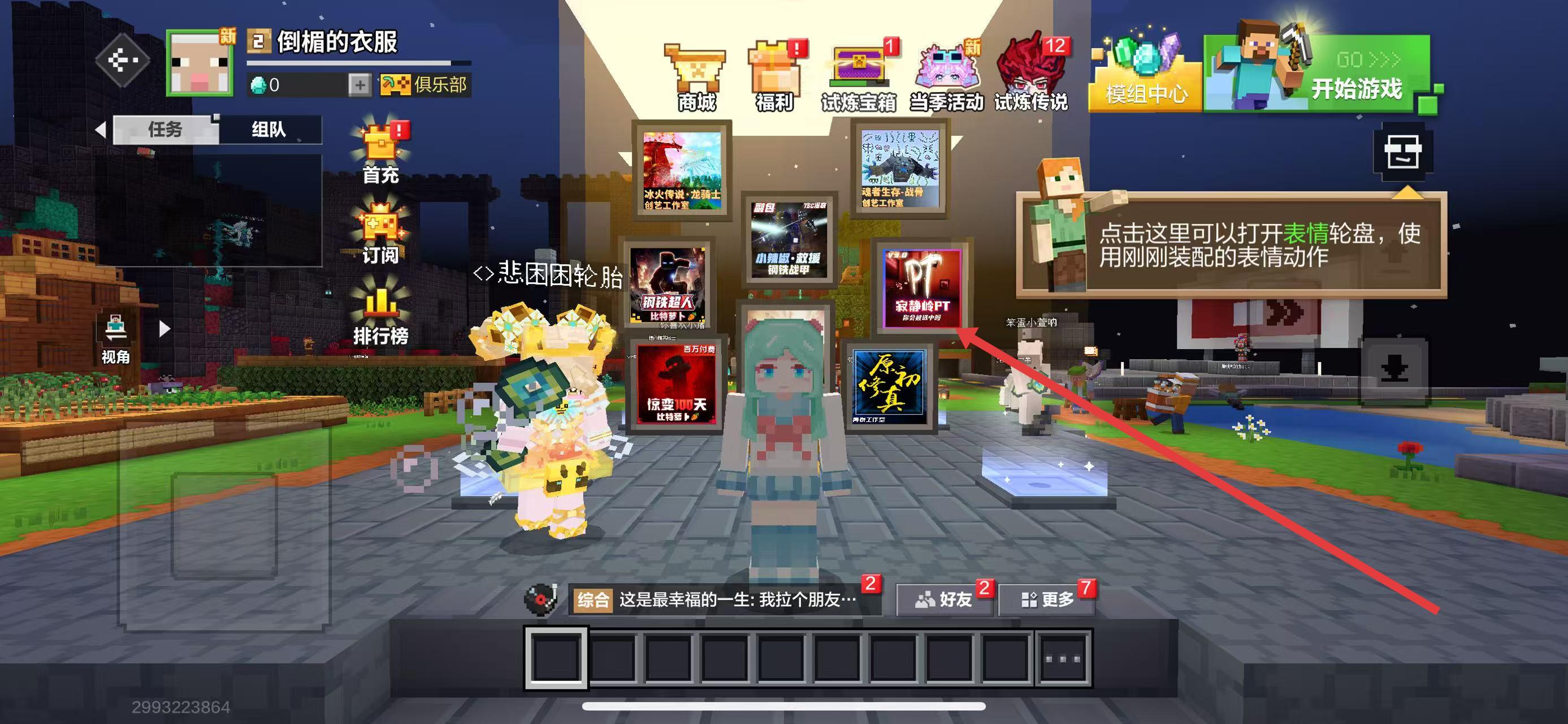 3、完成引导,在方块乐园场景,按提示点击对应位置,可打开表情轮盘,还能体验各类玩法与互动内容。