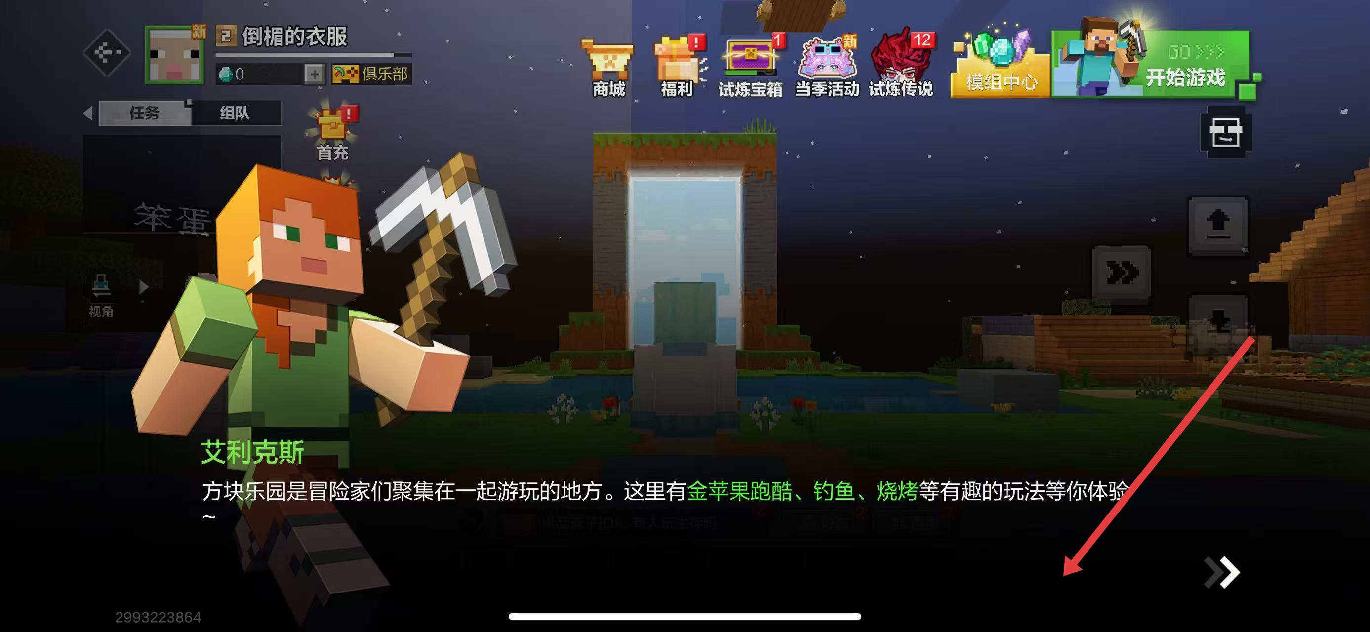 2、进入后出现艾利克斯引导,点击箭头按钮,了解方块乐园有金苹果跑酷、钓鱼等玩法,推进引导流程。