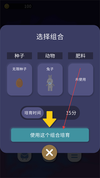 3、选择种子、动物和肥料的组合,点击使用这个组合培育,等待培育时间结束。