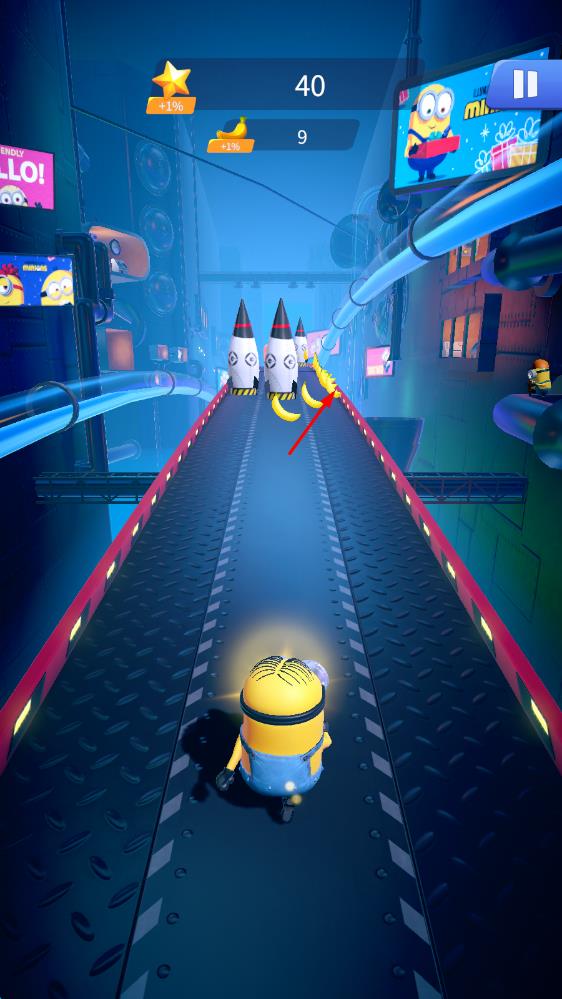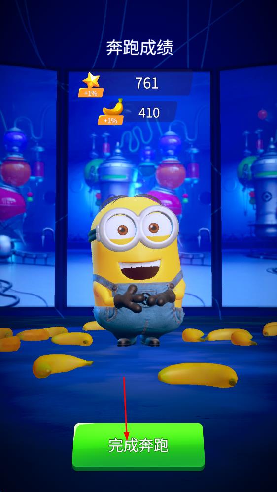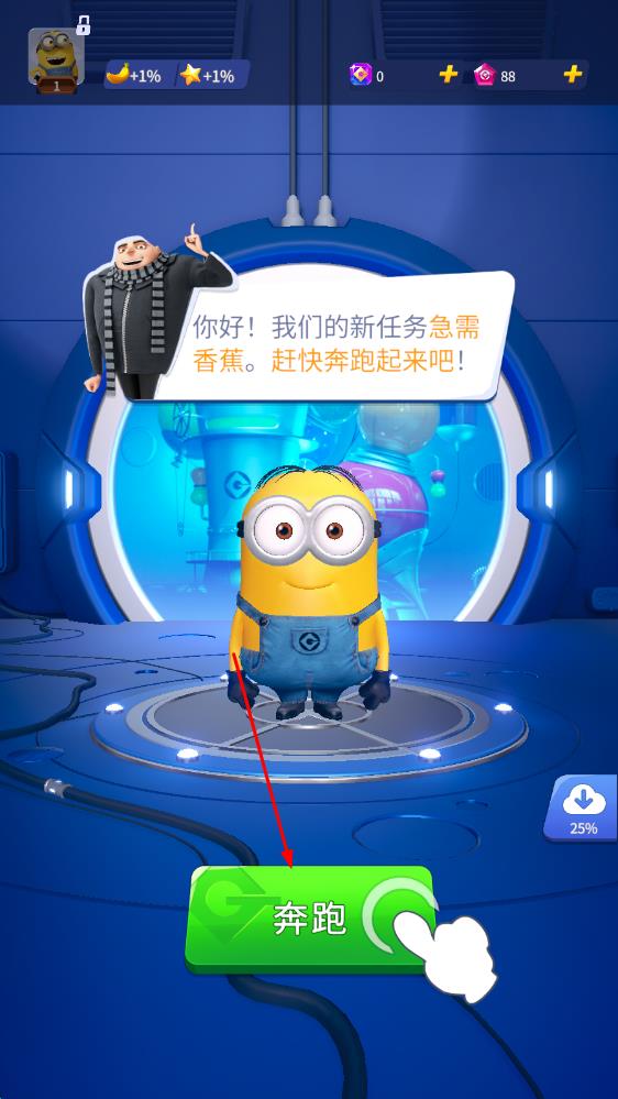 1、进入游戏后,选择心仪的小黄人角色,在格鲁的实验室等初始场景中,通过滑动屏幕控制小黄人跑、跳、闪躲,开启首场跑酷闯关。