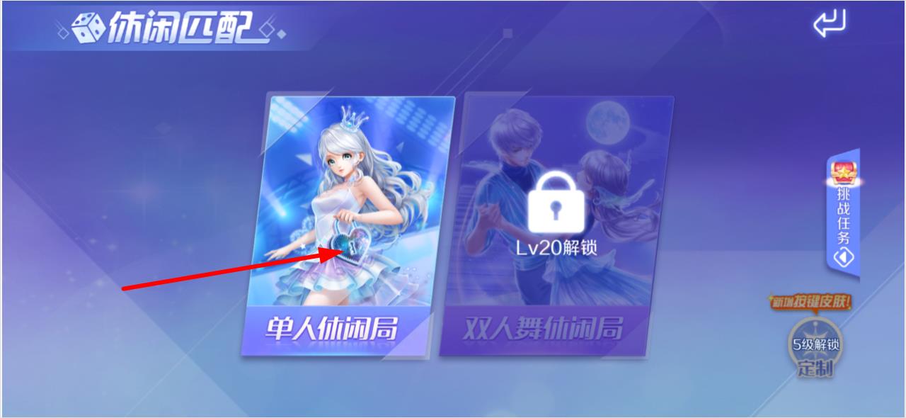 3、在休闲匹配界面,选择单人休闲局或符合解锁条件的双人舞休闲局选项,进入对应界面。