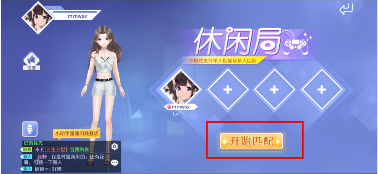 2、在游戏主界面,点击休闲匹配选项,进入休闲匹配界面。