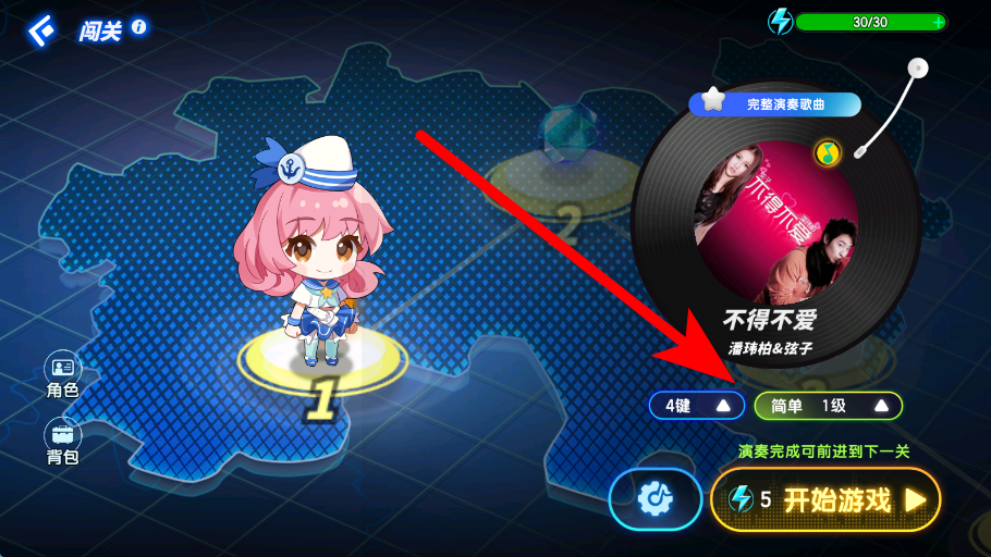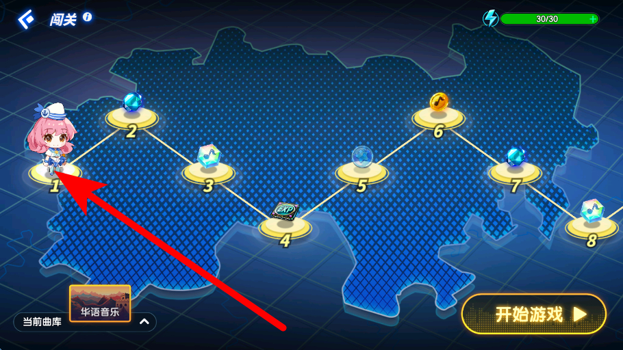 2、选择关卡需在闯关地图中,挑选想要挑战的关卡,确定后进入该关卡的歌曲选择界面,为接下来的音乐演奏做好准备。