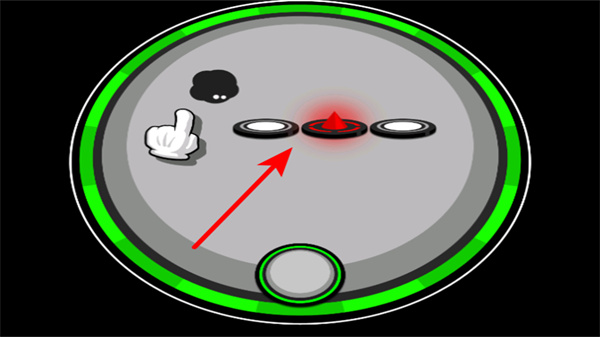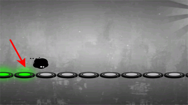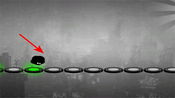 2、操控黑色小角色在绿色圆环上跳跃前进,跟随圆环的亮灭时机操作,确保角色持续移动。