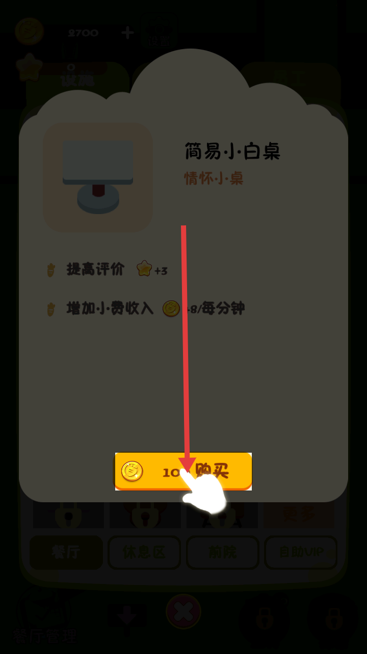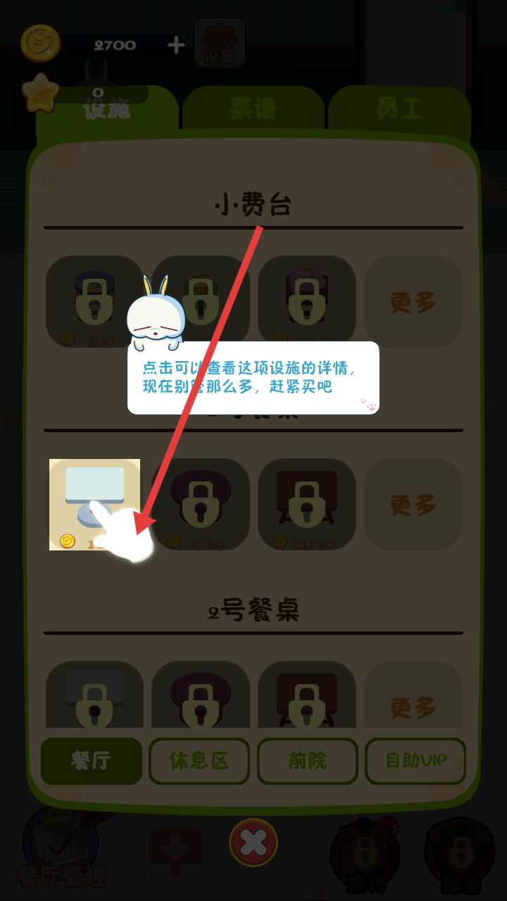 3、积累足够资金后扩建餐厅空间,添置流氓兔主题装饰提升环境等级,招聘员工分担服务工作,解锁高端菜品吸引VIP顾客扩大经营规模。