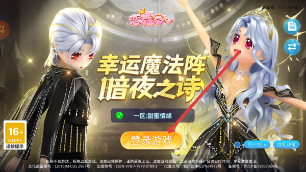 2、进入恋舞OL幸运魔法阵-暗夜之诗界面,点击橙色登录游戏按钮,进入角色创建准备环节。