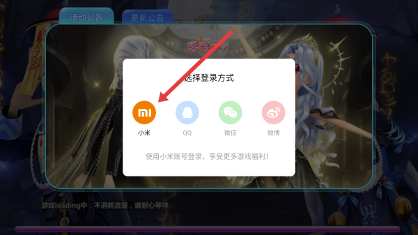 1、在恋舞OL登录方式选择界面,点击橙色小米图标,使用小米账号登录,可享游戏福利,开启游戏体验。