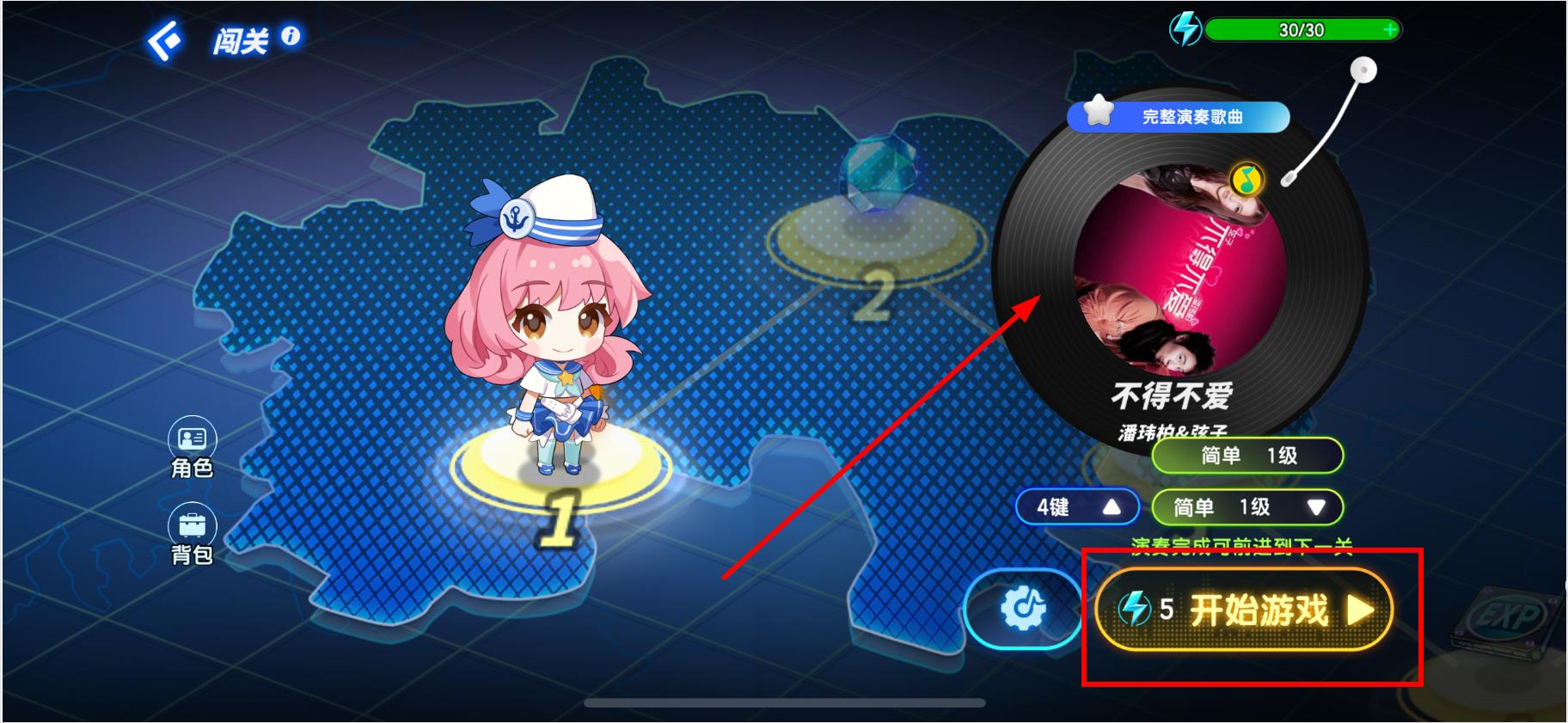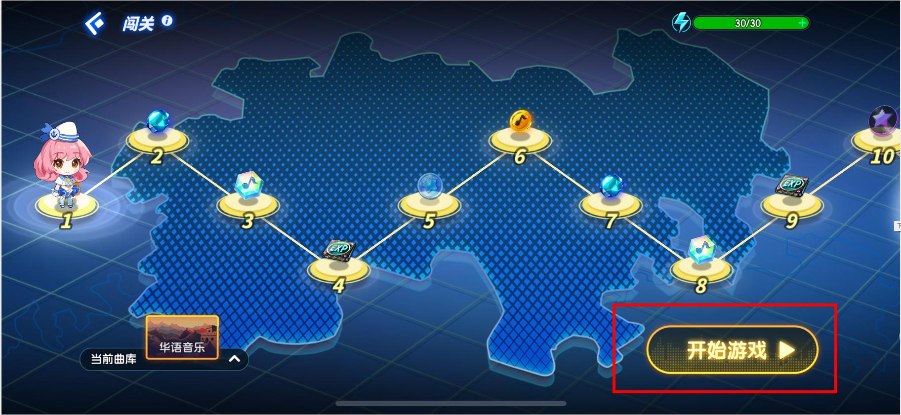 2、进入闯关界面后查看关卡路线图,点击开始游戏按钮。