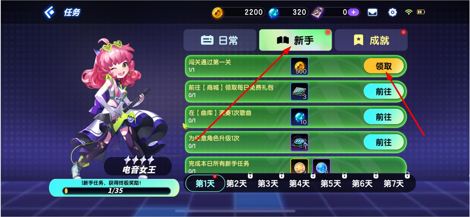 3、点击新手选项卡,完成新手任务,像闯关通过第一关、在曲库演奏歌曲、升级角色等,满足条件后点击领取就能获得金币。
