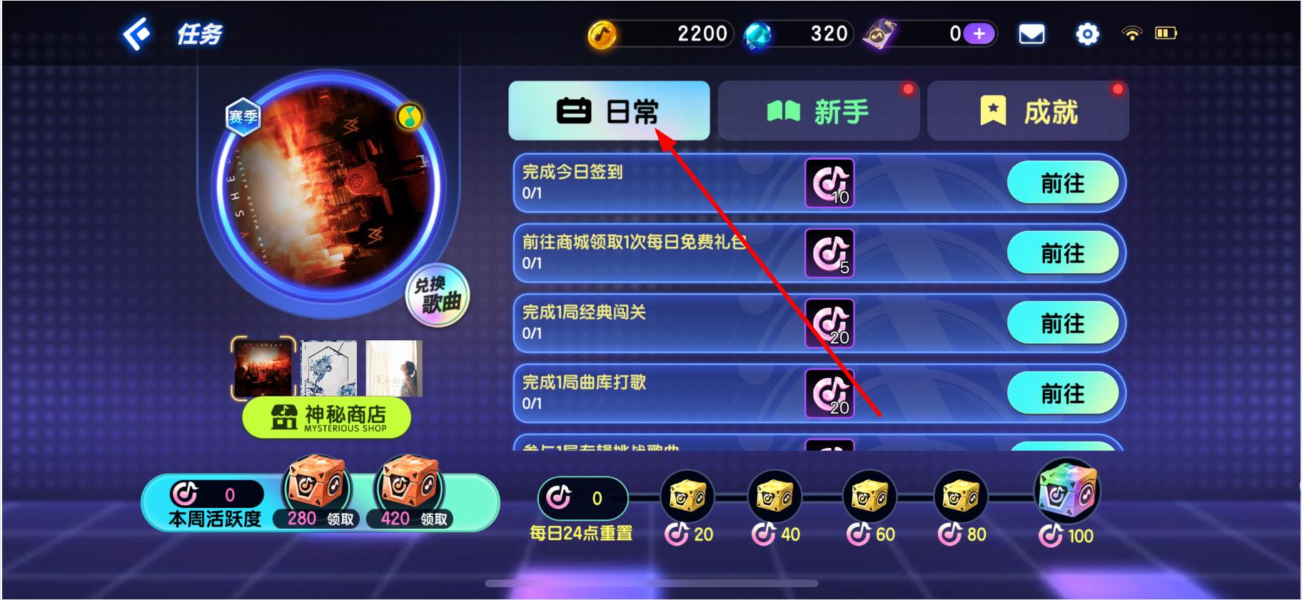2、在任务界面中点击日常选项卡,完成如签到、商城领礼包、闯关、打歌等日常任务,可获取对应数量的金币奖励