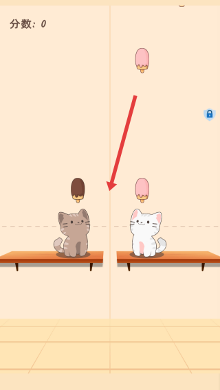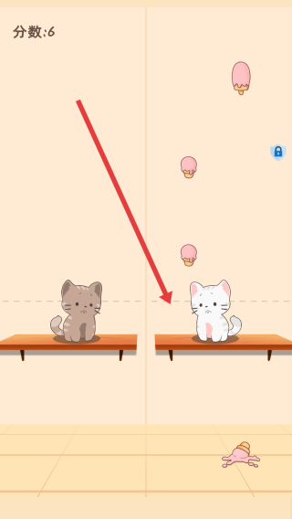 2、冰棒下落时,紧盯颜色,和冰棒掉落的方向和位置,快速拖动对应猫咪接住,避免漏接漏接猫咪会难过。