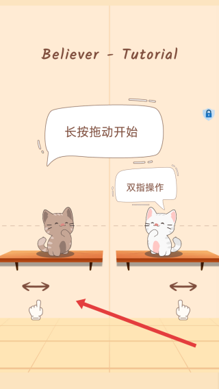 1、开局按照下面的教程提示,长按左右猫咪拖动,灰猫接棕色零食,白猫接粉色,双指操作分别控制。